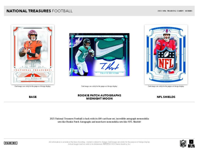 Perennially one of the most celebrated collector products, National Treasures Football returns with a spectacular lineup of collection makers that includes iconic RPAs and a simply sublime selection of autograph memorabilia stunners.National Treasures' bountiful booklet arsenal is absolutely second to none and includes legendary heavy hitters such as Rookie Jumbo Prime Signature Booklets, Treasured Dual Cuts, Elevated Ink, Rookie Triple Booklet and more!The stunning Super Bowl Immortality and Gladiators inserts feature an autograph parallel for selected players! Also find NFL Shields, featuring the biggest current stars and greatest legends.BOX: 8 autographs or memorabilia cards, 1 base or insert, 1 parallel